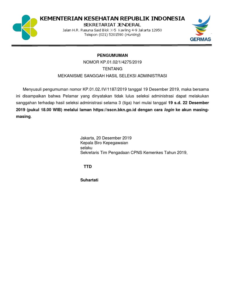 Kementerian kesehatan (kemenkes) telah menerbitkan pengumuman nomor kp.01.02/iv/2630/2020 tentang perubahan hasil seleksi kompetensi dasar dan pelaksanaan seleksi kompetensi bidang dengan protokol kesehatan pada penerimaan cpns kementerian kesehatan tahun 2019. Pengumuman pelaksanaan skb penerimaan cpns kemenkes formasi 2019. Panitia cpns kemenkes menjadwalkan pengumuman hasil seleksi administrasi pada bulan desember 2019 di website resmi sscn.bkn.go.id. Hasil tes cpns formasi yang diperebutkan. Kementerian kesehatan (kemenkes) telah menerbitkan pengumuman nomor kp.01.02/iv/2630/2020 tentang perubahan hasil seleksi kompetensi dasar dan pelaksanaan seleksi kompetensi bidang dengan protokol kesehatan pada penerimaan cpns kementerian kesehatan tahun 2019. Dapatkan informasi, inspirasi dan insight di email kamu. Kp.01.02/iv/1065/2019 informasi penerimaan calon pegawai negeri sipil tahun 2019 di lingkungan kementerian kesehatan berdasarkan keputusan menteri pendayagunaan aparatur negara dan reformasi birokrasi nomor 420 tahun 2019 tentang penetapan kebutuhan pegawai negeri sipil di lingkungan. Demikian pengumuman ini untuk diketahui dan dipenuhi maksudnya. Peserta yang dinyatakan lolos seleksi administrasi dapat mengetahui lokasi, jadwal dan sesi ujian dengan mencetak. Jadwal tes skb cpns kemenkes 2019 2020 di umumkan melalui siaran pers nomor : Lampiran i rekap hasil integrasi kemendikbud. Pengumuman hasil akhir seleksi administrasi akan ditayangkan pada tanggal 31 desember 2019. Plt kepala biro humas, hukum, dan kerja sama bkn paryono mengatakan, pengumuman hasil cpns 2019 memang benar akan dilakukan hari ini, jumat (30/10/2020).